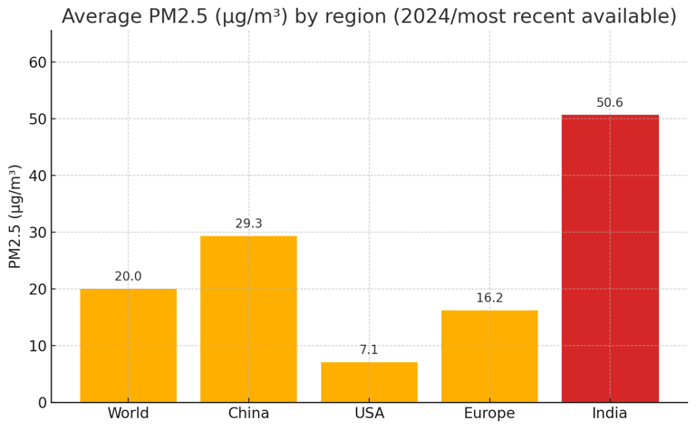 India consistently ranks among the countries with the highest PM2.5 levels. Below is a comparison of average annual PM2.5 exposure: